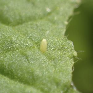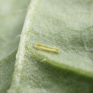 幼虫は細長いアオムシ型で背面中央に細く黄色い縦線があり、側面にも黄色い点線が入る。全体に細かい毛が生えていますが、目立つトゲや突起物はない。